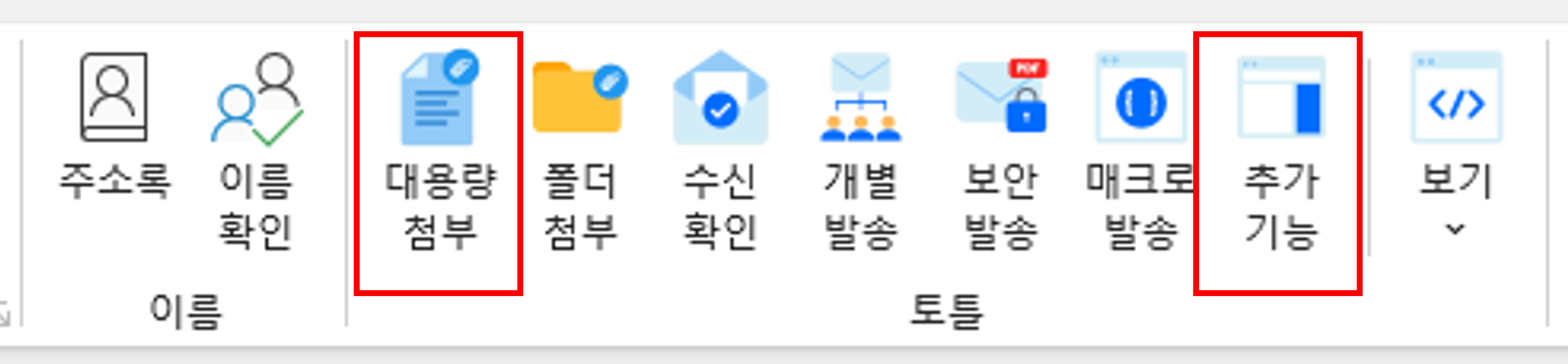 2. 아웃룩 메시지 탭 내 위치한 토틀 메뉴에서 대용량 첨부 또는 추가 기능을 클릭합니다.