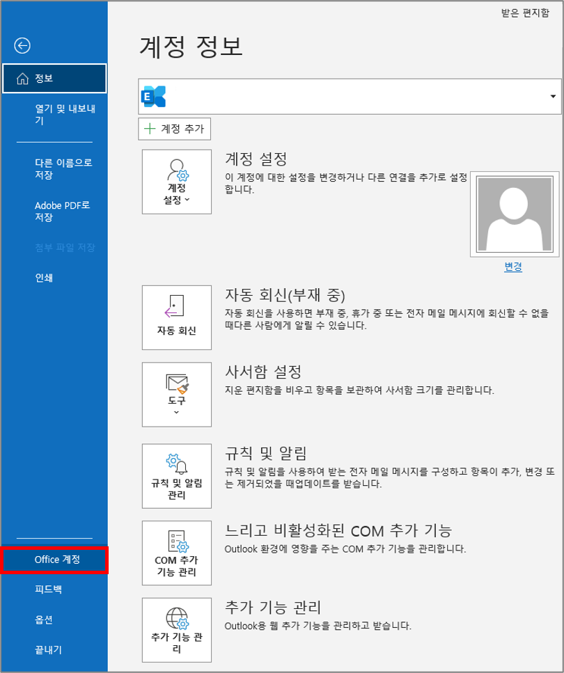 1. 아웃룩 상단 메뉴에서 파일을 선택한 후 Office 계정을 클릭합니다.