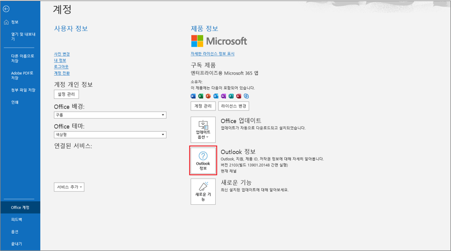 3. 우측 창의 제품 정보 중 Outlook 정보에서 버전 정보를 확인합니다.
