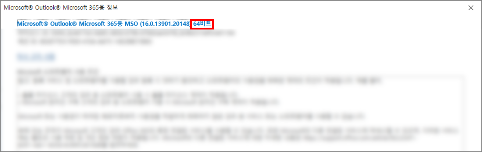 3. Outlook 정보 창 상단을 확인하면 버전정보와 32비트인지 64비트인지를 확인할 수 있습니다.