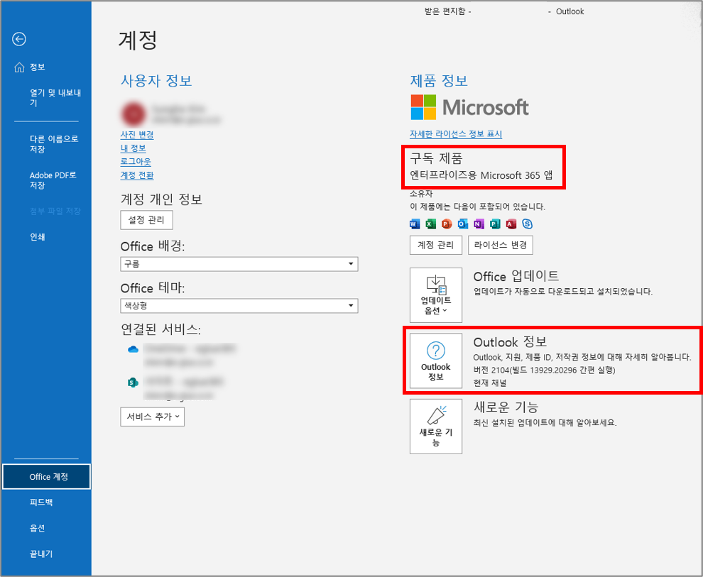 👉 Outlook 정보 아래 버전 번호에는 버전, 빌드 번호와 같은 상세 설치 정보가 포함되어 있습니다.