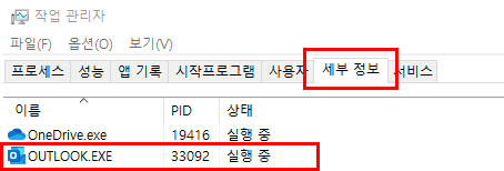 3. 만약 작업 관리자 프로세스 탭에서 실행 중인 Outlook이 확인되지 않는다면 세부정보 탭에서도 Outlook이 실행 중인지 한번 더 확인해 줍니다.