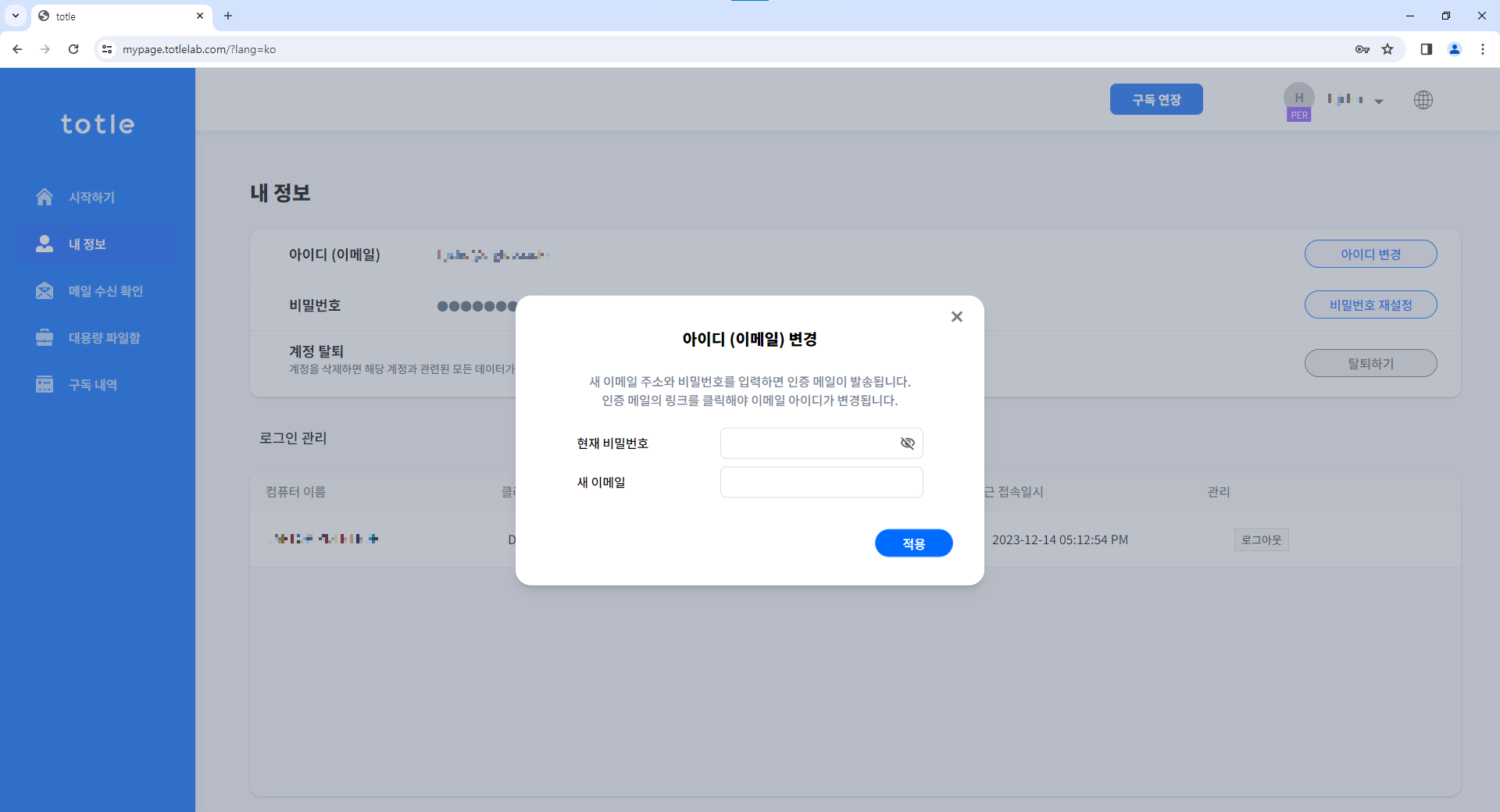 3. 기존에 사용하고 있던 토틀 비밀번호와 변경하고 싶은 새 이메일을 입력한 후 적용을 클릭합니다.