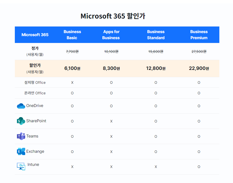 할인 기간동안 다음과 같이 안내된 가격으로 Microsft 365를 구독하실 수 있습니다.