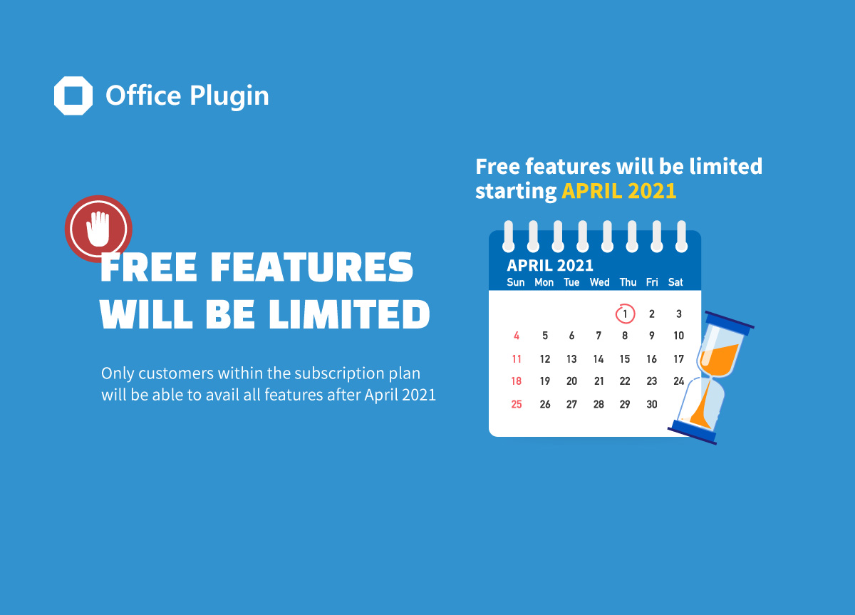The free version of Office Plugin features will be limited starting April 2021. You can still leverage some features of the free version, but the features will be limited for free users. Learn more details below!