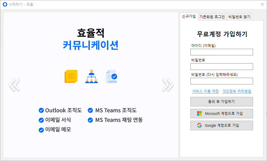 기존 Microsoft, 또는 Google 계정이 있는 경우 해당 계정으로 가입하기 버튼을 눌러 등록해 주시면 됩니다.