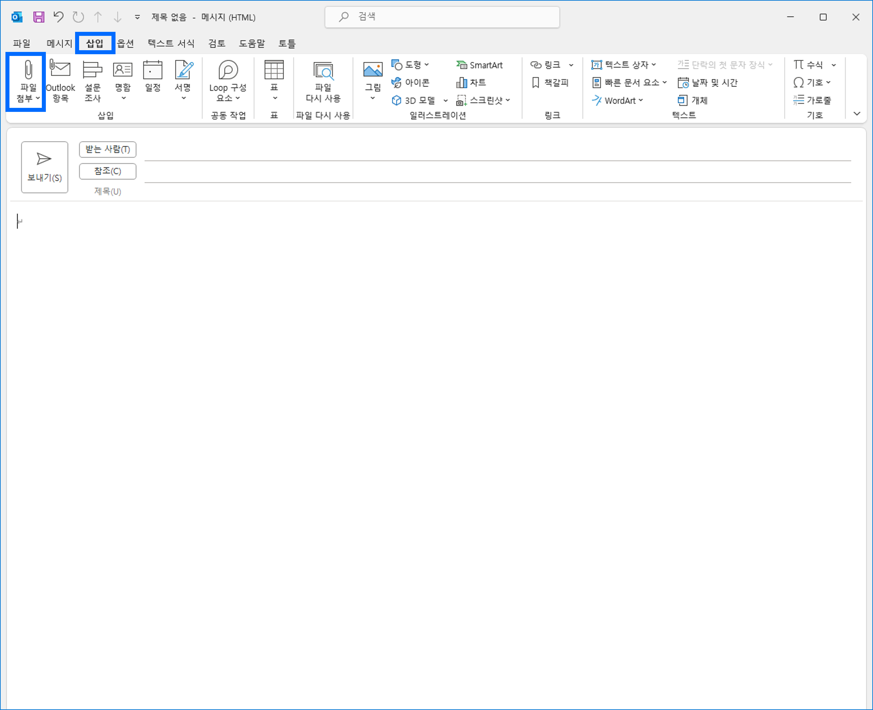 상단의 삽입 탭에 있는 📎파일 첨부 버튼을 클릭해주세요.