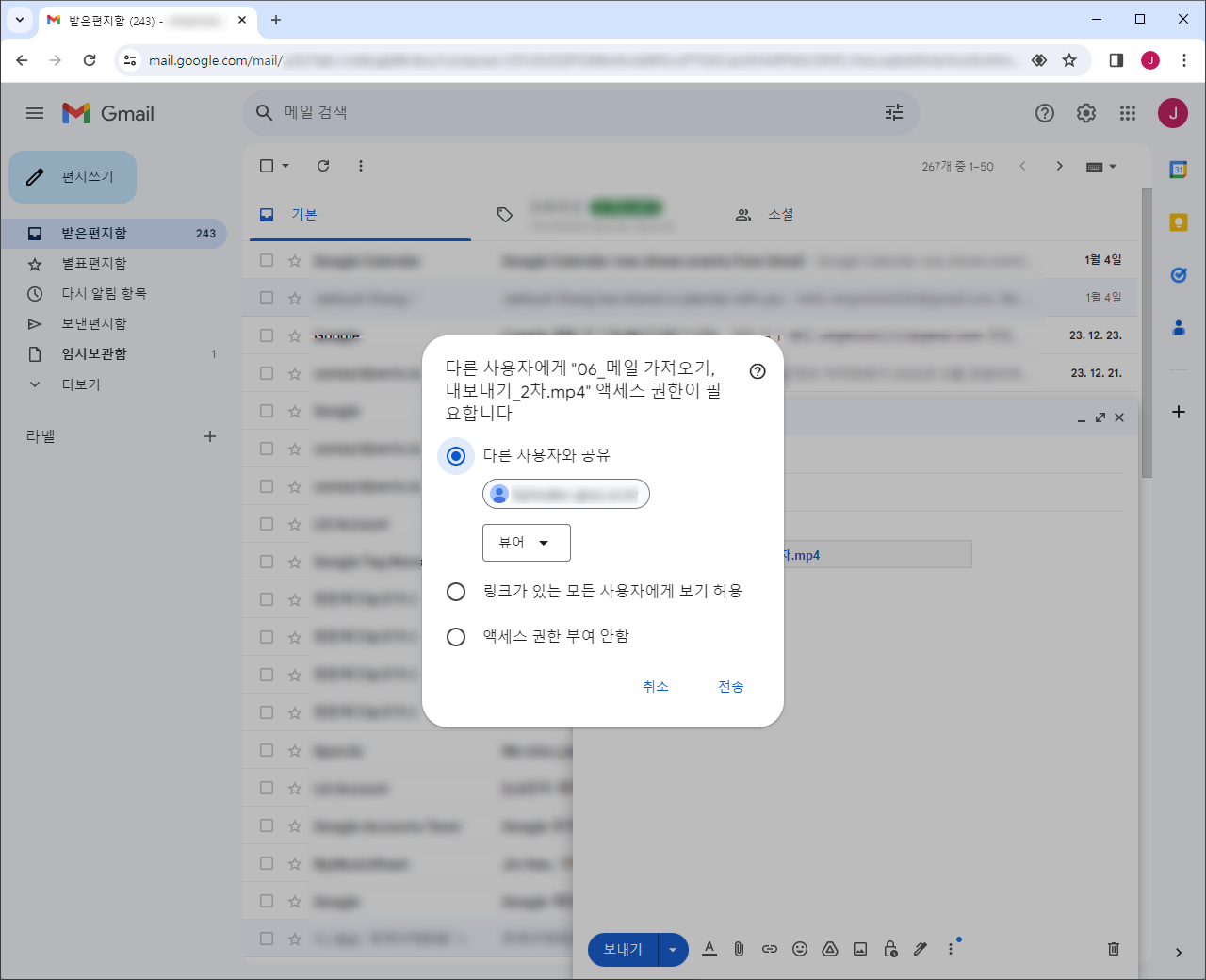 이러한 방식으로 대용량 첨부파일을 보내게 되면 구글 드라이브 파일에 접근할 파일 액세스 권한을 부여하는 절차가 필요한데요.