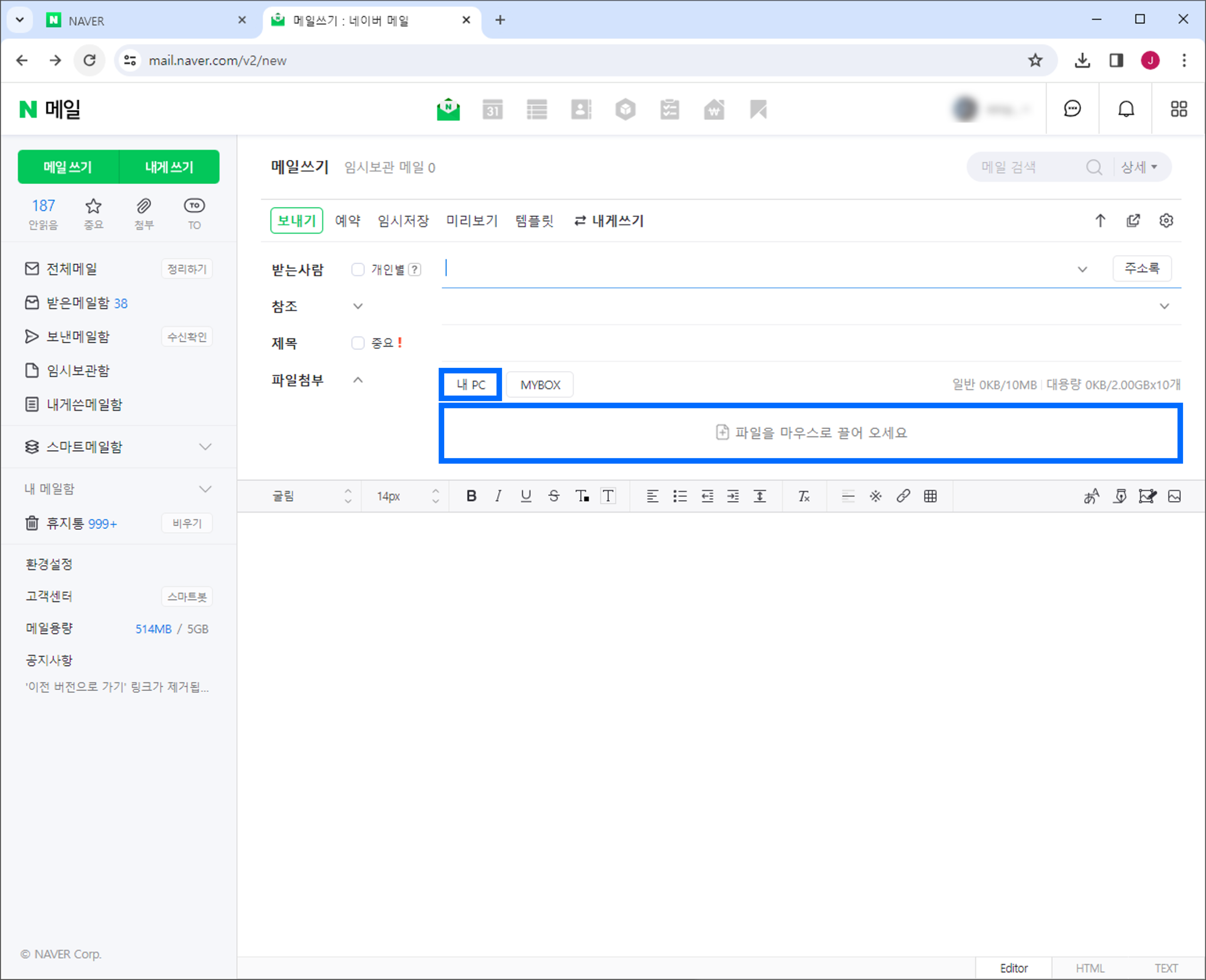 네이버 메일에서 대용량 파일을 첨부하는 방법은 다음과 같습니다.