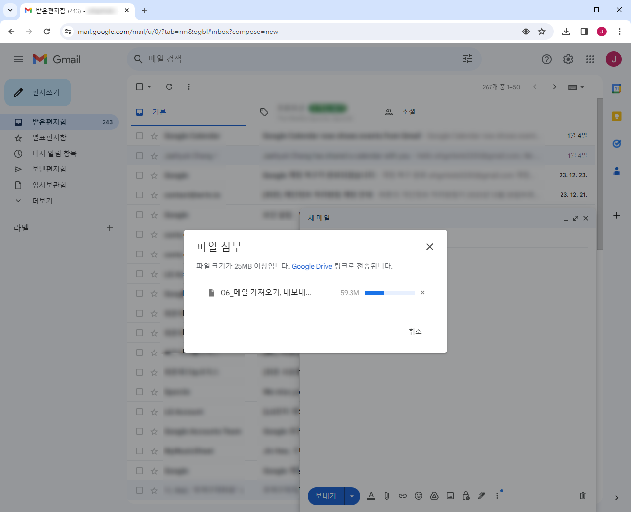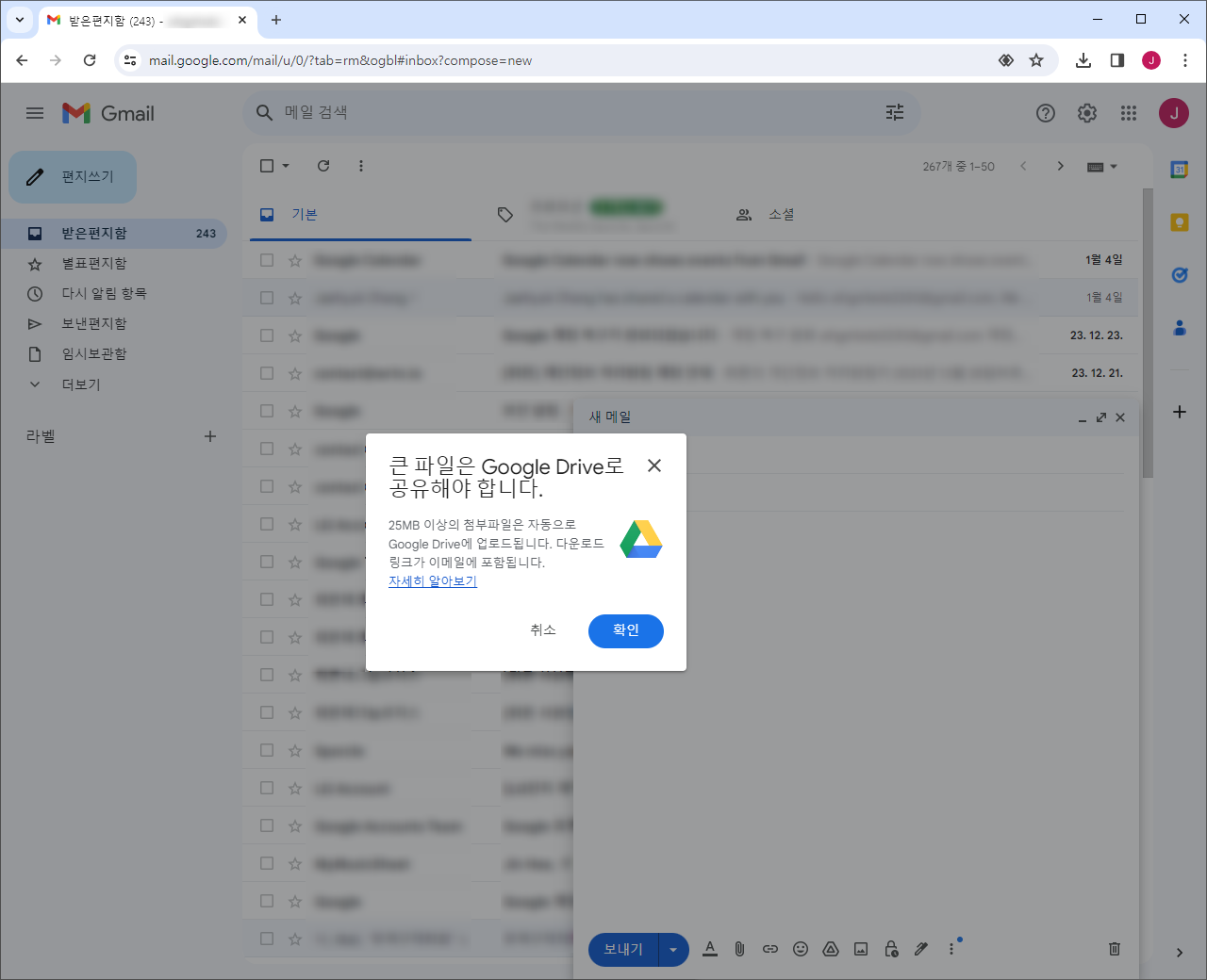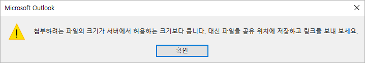 기준 용량(25MB)을 초과하는 파일을 첨부할 경우 다음과 같은 팝업창이 나타납니다.