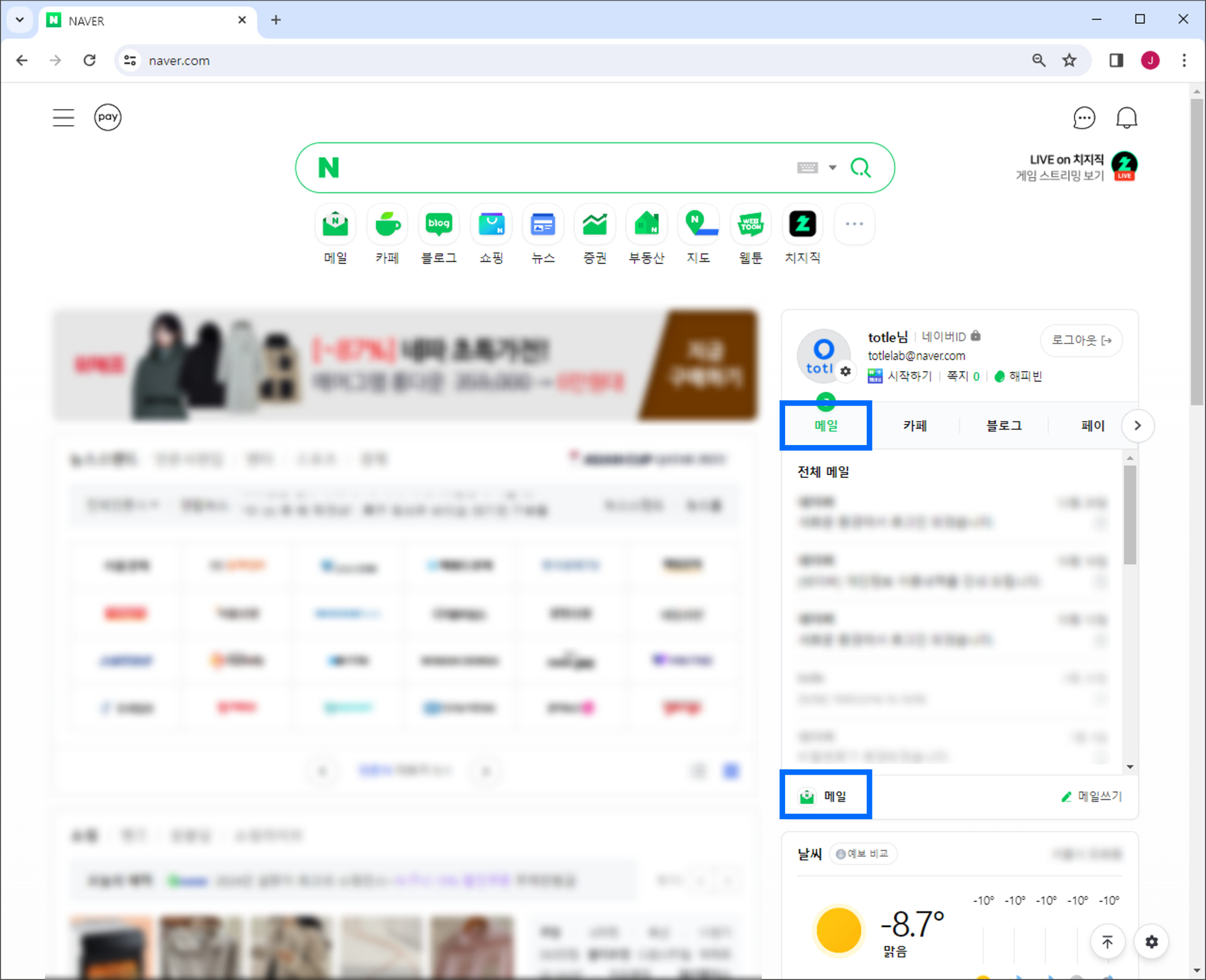 네이버 홈에서 메일 탭을 열어 아래 📧메일 버튼을 클릭해 주세요.