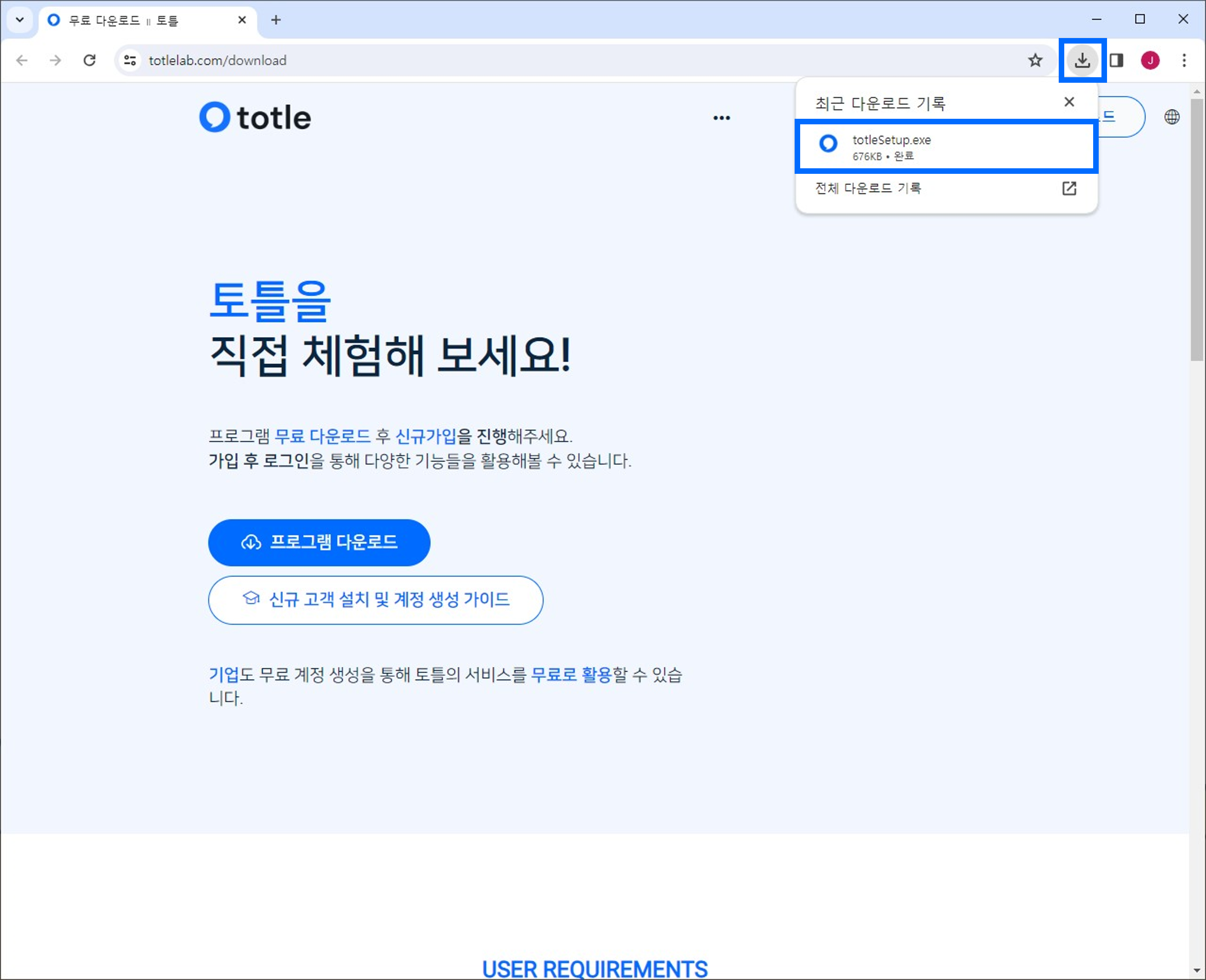 화면 우측 상단의 ⬇저장 아이콘을 클릭한 후, totleSetup.exe 파일을 실행하여 토틀을 설치해주세요.