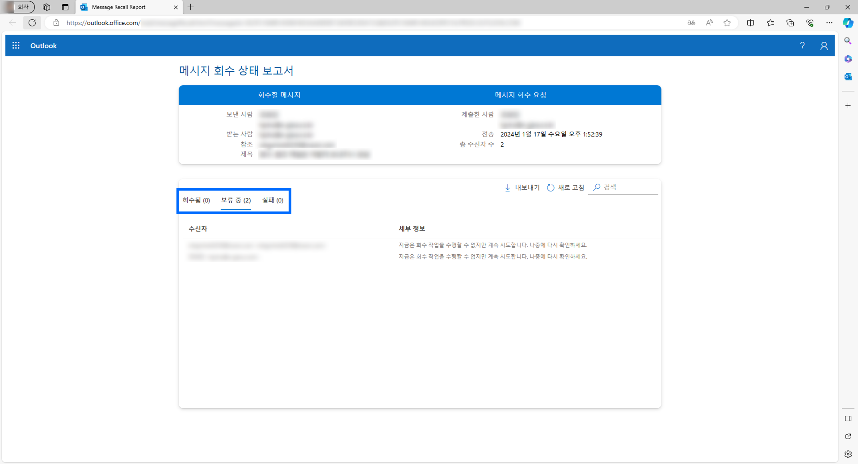 그러면 메시지 회수를 시도했던 메일의 상태를 알려주는 메시지 회수 상태 보고서를 볼 수 있습니다.
