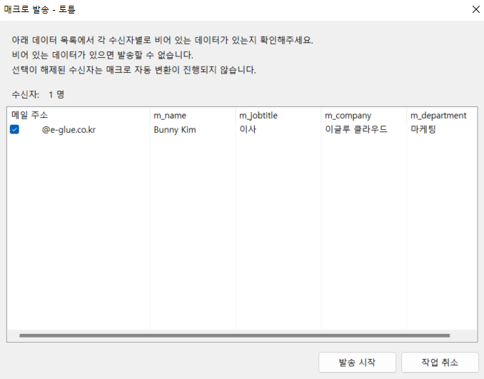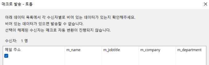 ※ 삽입한 매크로 값 중 연락처에 저장되지 않은 값이 있을 경우 이메일 전송이 불가능 합니다.
