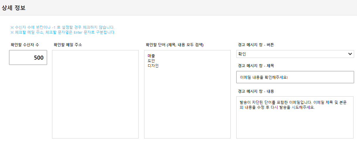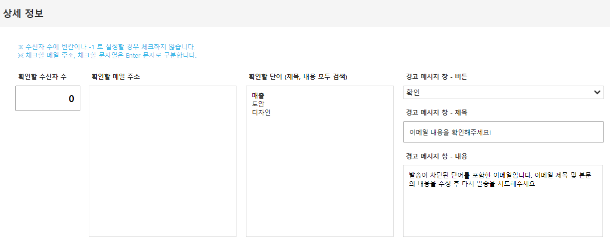이메일 발송 시 제목 혹은 메일 본문에 특정 단어를 포함한 경우 이메일 발송을 제한하거나 경고 메시지 창을 띄울 수 있습니다.