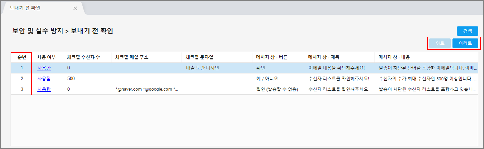 👉 보내기 전 확인 조건들의 순번을 아래 위로 이동해 손쉽게 우선순위를 지정할 수 있습니다.